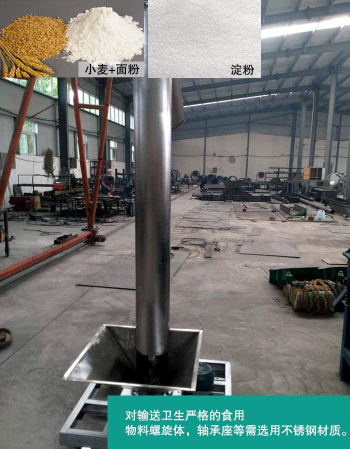 (1)對輸送衛(wèi)生嚴(yán)格的食品行業(yè),螺旋輸送機(jī)的機(jī)殼,螺旋體,軸承座等與物料觸摸的部件,需選用不銹鋼,銅等材質(zhì)制成